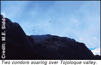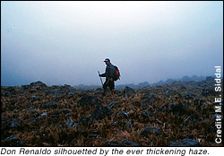 It was still before noon when we had to bug out of the valleyDon Renaldo was insistent and I wasn't going to argue. Fifteen minutes later, moving back up towards the pass, were it not for Don Renaldo's knowledge of what seemed like every boulder, ridge and gully, I'd have just plopped myself down for want of any sense of direction. Visibility was about 5 feet at best, but we made it back to the pass and out of the clouds without incident. For the next two minutes we sat there ravenously consuming a can of fruit cocktail, pancito with peanut butter, cheese and the last of our water. By the time we had finished it was clear that we'd run out of time. Just below us the clouds were wisping up and over the outcroppings. We were too high up. It was now or never and I wasn't dressed for a night on a mountain top. Everything was hastily packed away and we started down. I was confused. Why was I out of breath? Downhill usually doesn't do that to me anymore. As my head cleared I realized we were running down the mountain! It was more like controlled high-speed stumbling. Was Don Renaldo serious? Running and leaping over steep loose shale? I was out of my league.