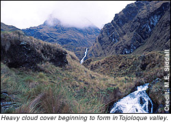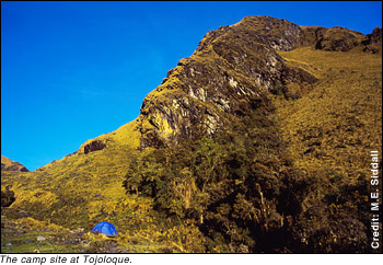 Date: October 25, 1999 Location: Tojoloque, in my tent awake 45 minutes earlier than necessary. Altitude: A lot lower than it'll be in a few hours 4:48 a.m. As I stood outside facing north at the edge of the small cliff next to my tent, high up on my left the full moon had already ducked behind a high peak and cast an incandescent glow like a magnesium flare burning beyond the mountain tops. Its light cast shadows distorting shapes more familiar by day and lit up the south ridge I will climb in an hour. I'm going to take only the bare minimum for collecting leeches with me so as not to slow our pace. 5:13 p.m. I'd had a quick breakfast, gathered my stuff and left camp at about 6:05 am. The sun was only just peeking out from behind the mountains to the east. I asked Don Renaldo how long he thought it would take us to make the pass. Three hours was his estimate, then another hour from the pass to the lakes. All together a 4-hour hike. I was determined to prove him wrong since I needed more time for collecting.