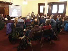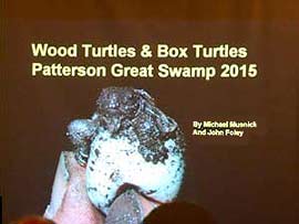 by Michael Musnick and John Foley Long-time NYTTS member and citizen scientist Michael Musnick has spent the last 14 years studying wood and box turtles, and this is his 11th season following them with radio tracking equipment. His main interest has been to determine where they hibernate, estivate and nest. He has monitored their yearly survival, and nesting site fidelity, reproductive fitness of females, with special focus on juveniles as indicators of recruitment. He has examined reasons for mortality and has made efforts to stem that loss. Co-presenting this talk was John Foley, also a member of NYTTS, who has worked closely with Michael on this study for the last seven years and has shared responsibility for collecting the data on wood, box, and bog turtles. John is currently head naturalist at Great Hollow Nature Preserve, an 825 acre wildlife sanctuary in Fairfield County, Connecticut. He has also worked with the Connecticut Department of Energy and Environmental Protection. A number of members and new faces showed up at our new meeting space and thoroughly enjoyed Michaels and Johns presentation. However, because technical problems prevented videos from being shown, we are presenting one of the key videos here this one from NPRs Science Friday entitled Tiny Turtle Bridges: