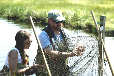 Graduate student Rachel Rutherford and Professor Hal Avery retrieve a terrapin from a trap in Barnegat Bay, New Jersey.