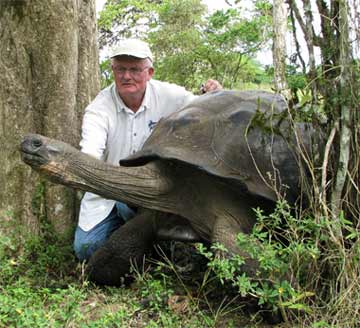 Peter Pritchard with a large adult male Santa Cruz tortoise (Chelonoidis porteri)