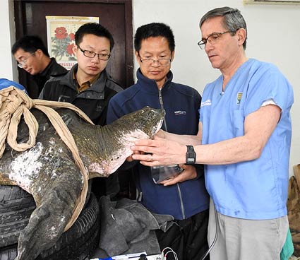 Drs. Paul Calle (right) and Liu Lu Shunqing (center) from the Wildlife Conservation Society examine the sedated male Rafetus during artificial insemination procedures at the Suzhou Zoo.