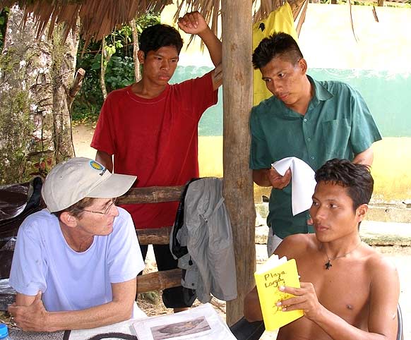 Anne Meylan confers with Virgilio Beker, Ramiro Beker and Arcelio Gonzales Hooker about