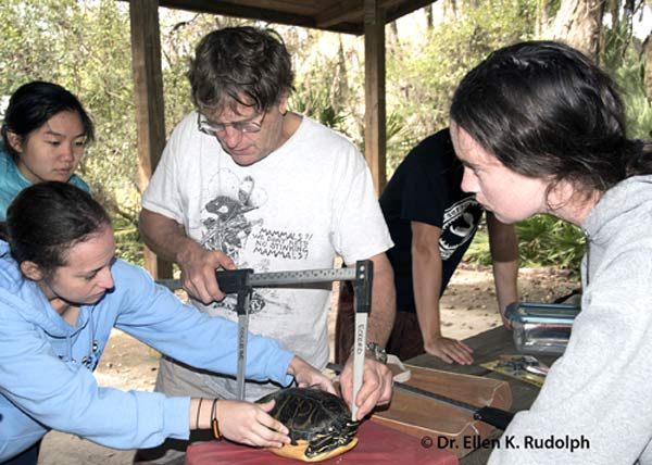 Peter Meylan teaching students from Eckerd College how to measure turtles for his Rainbow Run mark/recapture project, which was initiated in 1990.